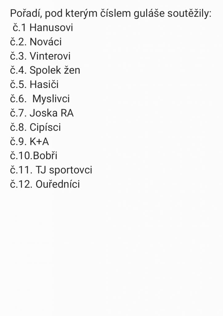 Do Gulášobraní se nám přihlásilo 12 soutěžních gulášů, zastoupeny byly všechny spolky v obci, ale zúčastnily se i rodinné týmy nebo party přátel. I když jde o soutěž, není podstatné, kdo nakonec vyhrál a kolik kdo dostal bodů, ale hlavní cílem je možnost se potkat se sousedy, kamarády a ostatními známými. Poděkování patří všem, kteří svůj guláš přihlásili a nebáli se jít do tohoto klání. Vítězný guláš myslivců měl č. 6 , druhý v pořadí byl guláš s č. 2 - Nováci a třetí místo získal guláš č. 12 - Ouředníci. Odpoledne si snad užili všichni a při harmonice jsme si zazpívali a pobavili se.